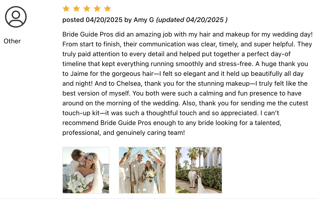 Welcome to Bride Guide Pros, the Florida Panhandle’s multi award-winning, premier choice for on - location airbrush bridal makeup and bridal hair styling. Our artists are experienced with all skin tones, and can accomplish the most natural look to the most dramatic glam, and anything in between.